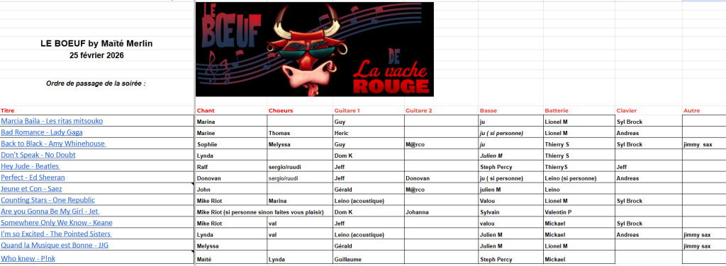 Plein de prestations d’excellent niveau hier soir, pour ces morceaux figurant très souvent dans les blind tests de Maïté Merlin, comme elle l’a rappelé. En voici quelques extraits (Marcia Baila, Back to Black, Don’t speak, Are You Gonna Be My Girl). Vous pouvez en trouver d’autres sur la page Facebook de Jacky Charras.