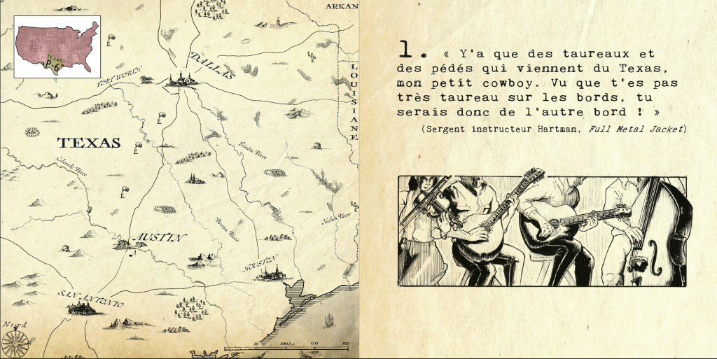 Ce n’est pas un livre « classique », et alors ? C’est justement ce qui fait son charme. On pourra l’aborder de différentes manières et le savourer de plusieurs façons. La verve du père, le coup de crayon du fils, l’œil photographique des deux, voilà qui plante le décor d’un contexte baignant dans l’Americana, avec toutes ses références au cinéma, à la musique et aux grands mythes des Etats-Unis, mais j’imagine en confrontant la réalité avec nos fantasmes d’européens.