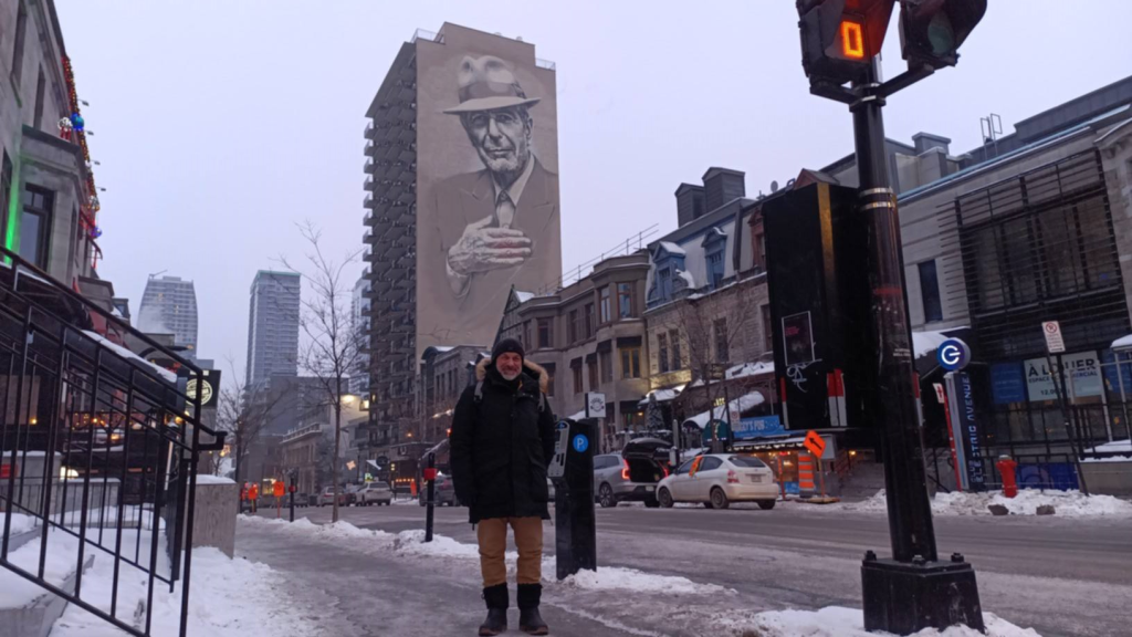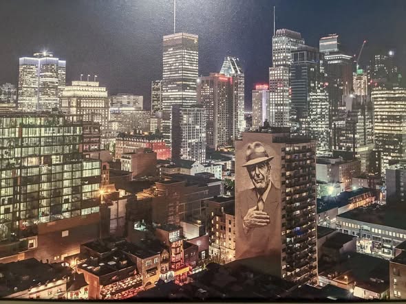 En arrivant à Montréal samedi après-midi, le guide nous a fait passer non loin de l’immense portrait de Leonard Cohen, peint sur un mur de la ville. Une image que j’ai revue dans le hall de l’hôtel !