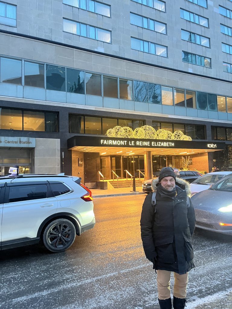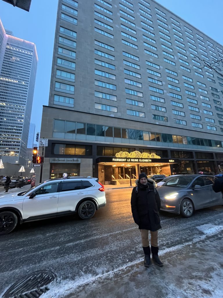Un peu plus tard dans l’après-midi (après avoir fait la photo devant le mur de Leonard Cohen), je reviens à l’hôtel Reine Élizabeth où je demande à un autre employé de me prendre en photo devant le bâtiment. Il s’est exécuté bien volontiers et me l’a envoyée par mail ! Et tout comme son collègue et le passant, leur seule réponse à mes remerciements a été « ça fait plaisir ». Imaginerait-on une attitude similaire de la part de parisiens envers des touristes étrangers ?…